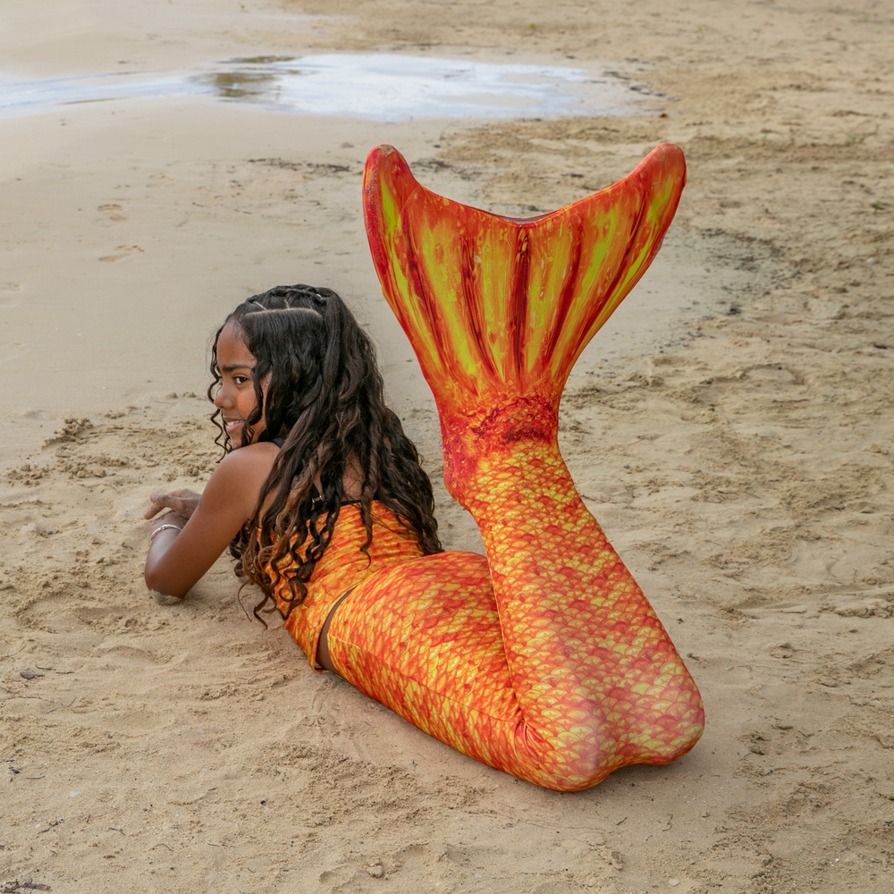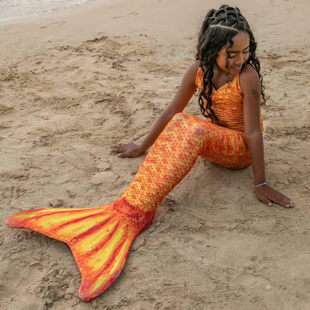 Glänze und strahle wie die Sonne in der Tropical Sunrise Meerjungfrauenflosse aus der Mermaiden Destiny Kollektion! Die leuchtendsten Farben des Himmels werden in dieser wunderschönen, gelb-orange geschuppten, schwimmbaren Meerjungfrauenflosse lebendig – sie glänzt sowohl an Land als auch im Wasser.